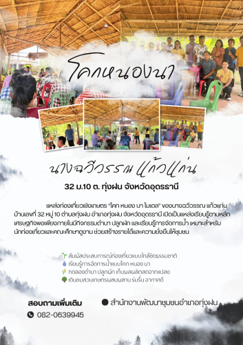 อุดรธานี – แหล่งเรียนรู้และท่องเที่ยวเชิงเกษตร “โคก หนอง นา โมเดล” ของ นางฉวีวรรณ แก้วแก่น ตั้งอยู่ที่บ้านเลขที่ 32 หมู่ที่ 10 ตำบลทุ่งฝน อำเภอทุ่งฝน จังหวัดอุดรธานี กำลังได้รับความสนใจจากประชาชนและหน่วยงานต่าง ๆ ที่ต้องการศึกษาแนวทางการทำเกษตรทฤษฎีใหม่ควบคู่กับการท่องเที่ยวชุมชน